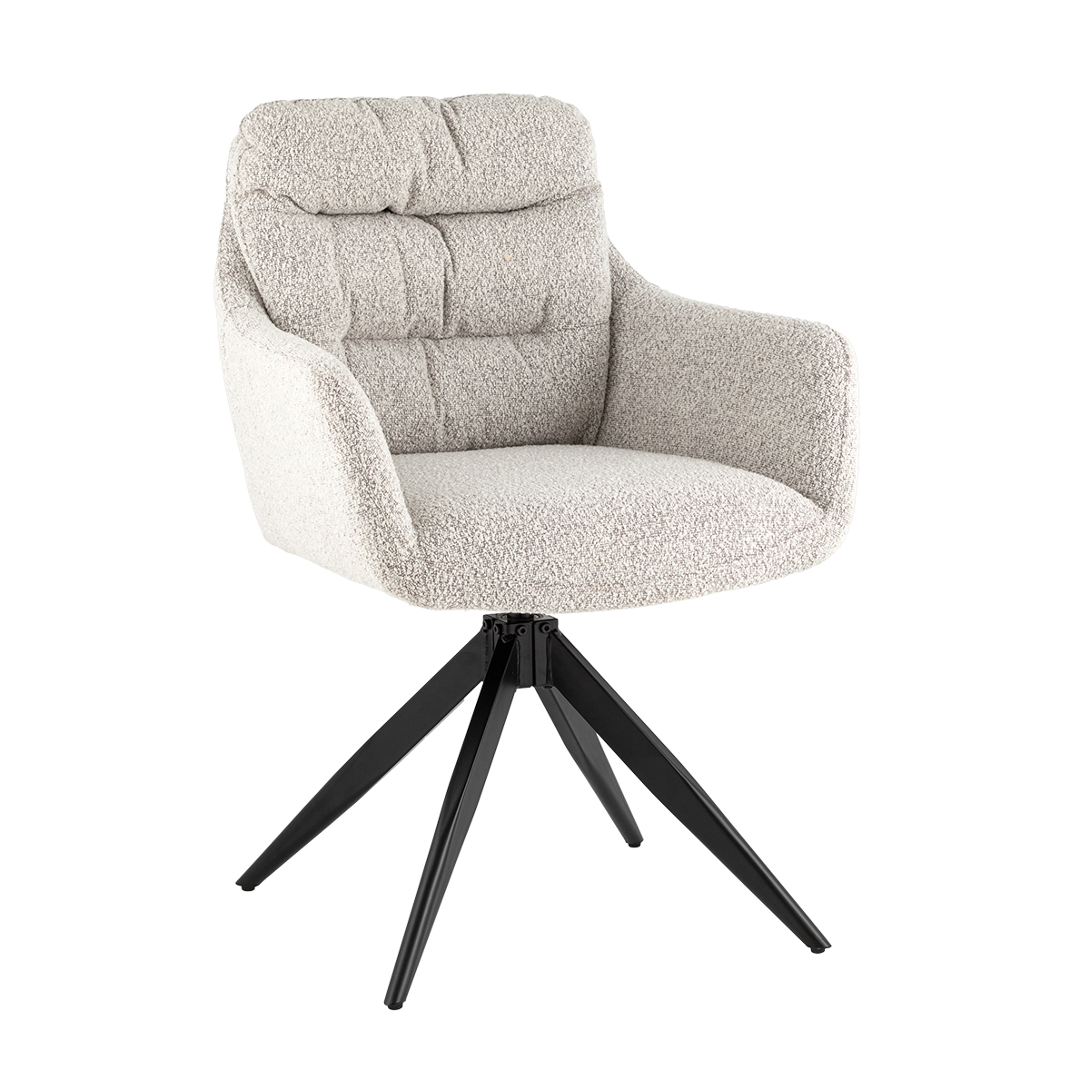 Обивка из ткани букле добавляет текстуры и создаёт приятные тактильные ощущения, делая стул особенно комфортным для сидения. Мягкое сиденье обеспечивает дополнительное удобство, а подлокотники создают ощущение поддержки и уюта, идеально подходя для длительного пребывания за столом.